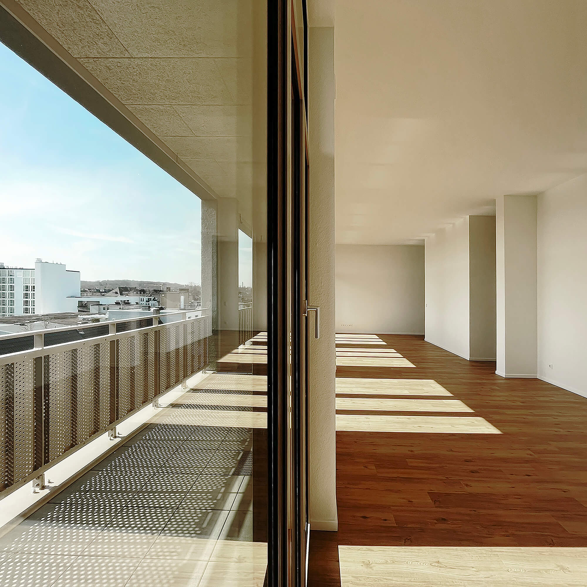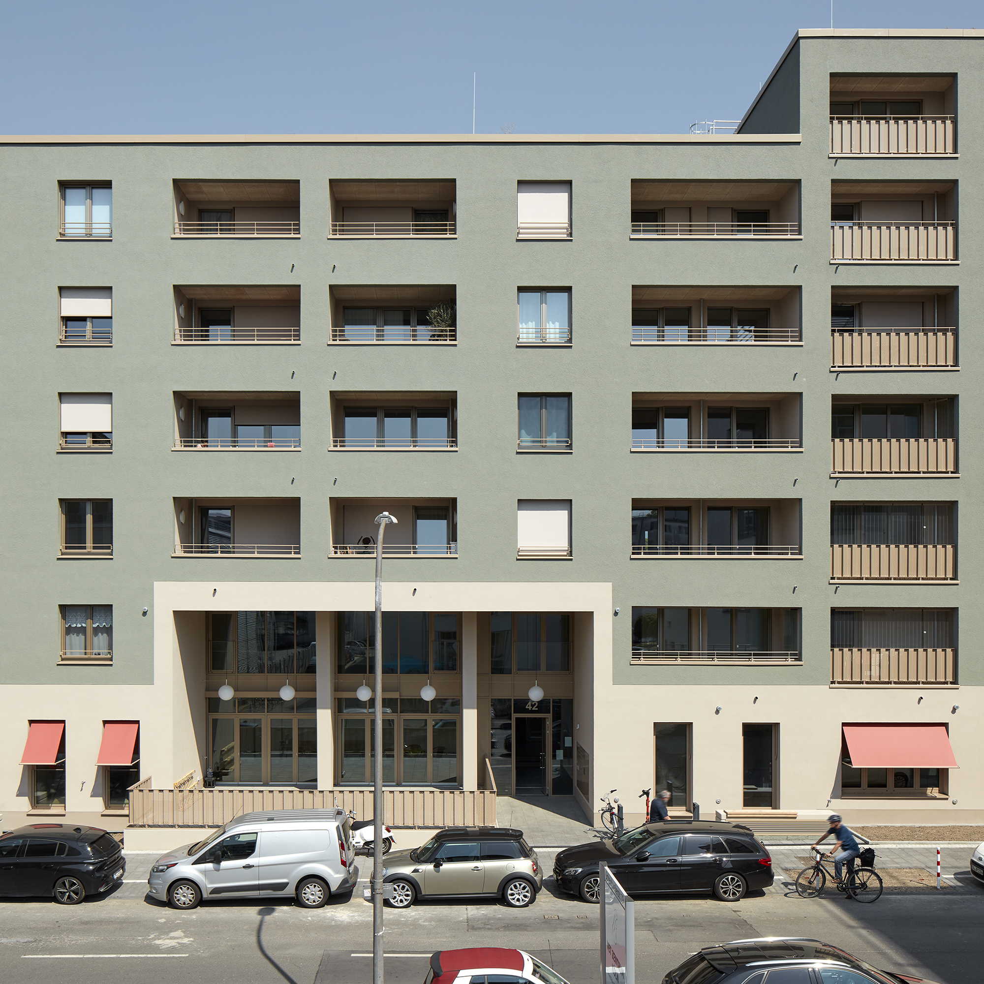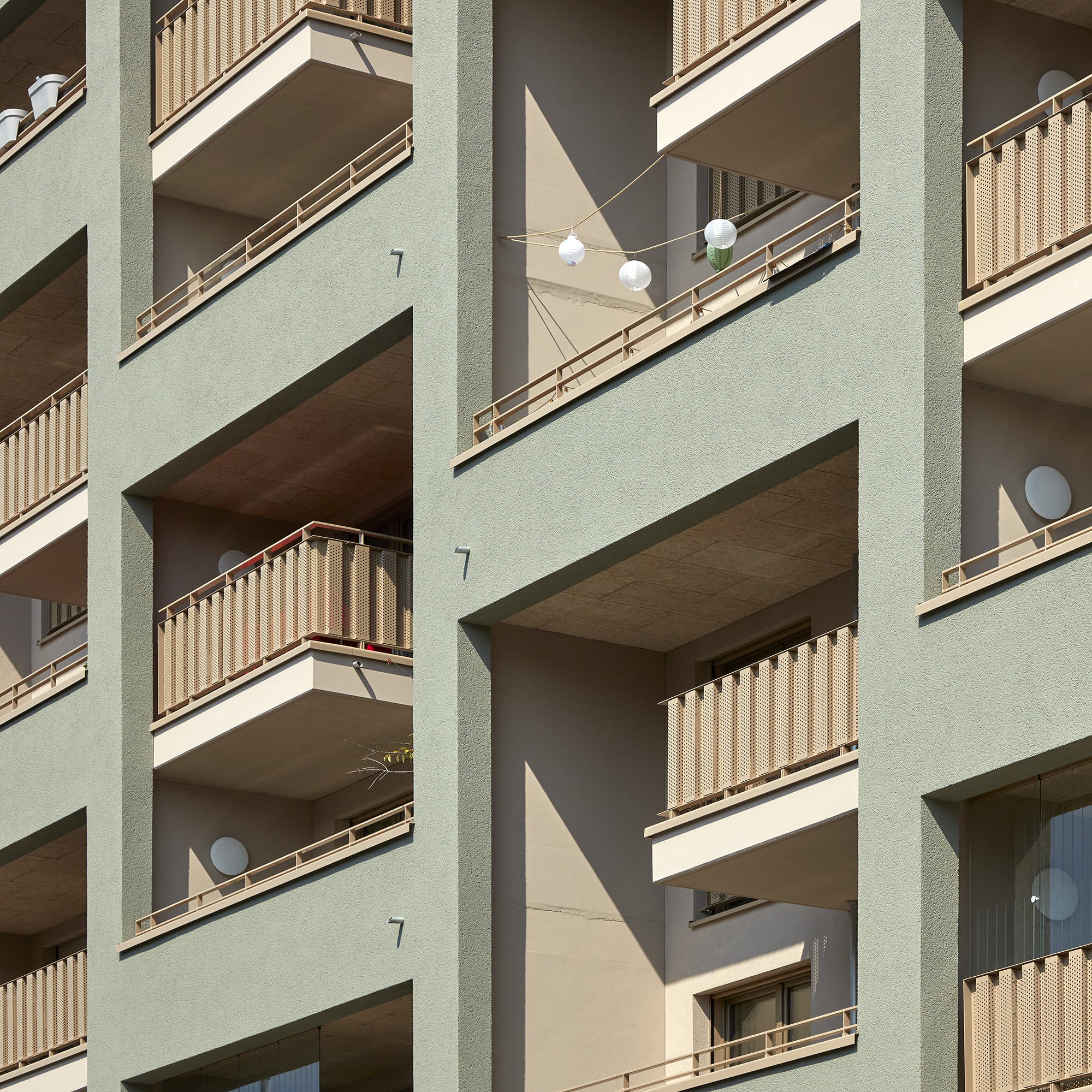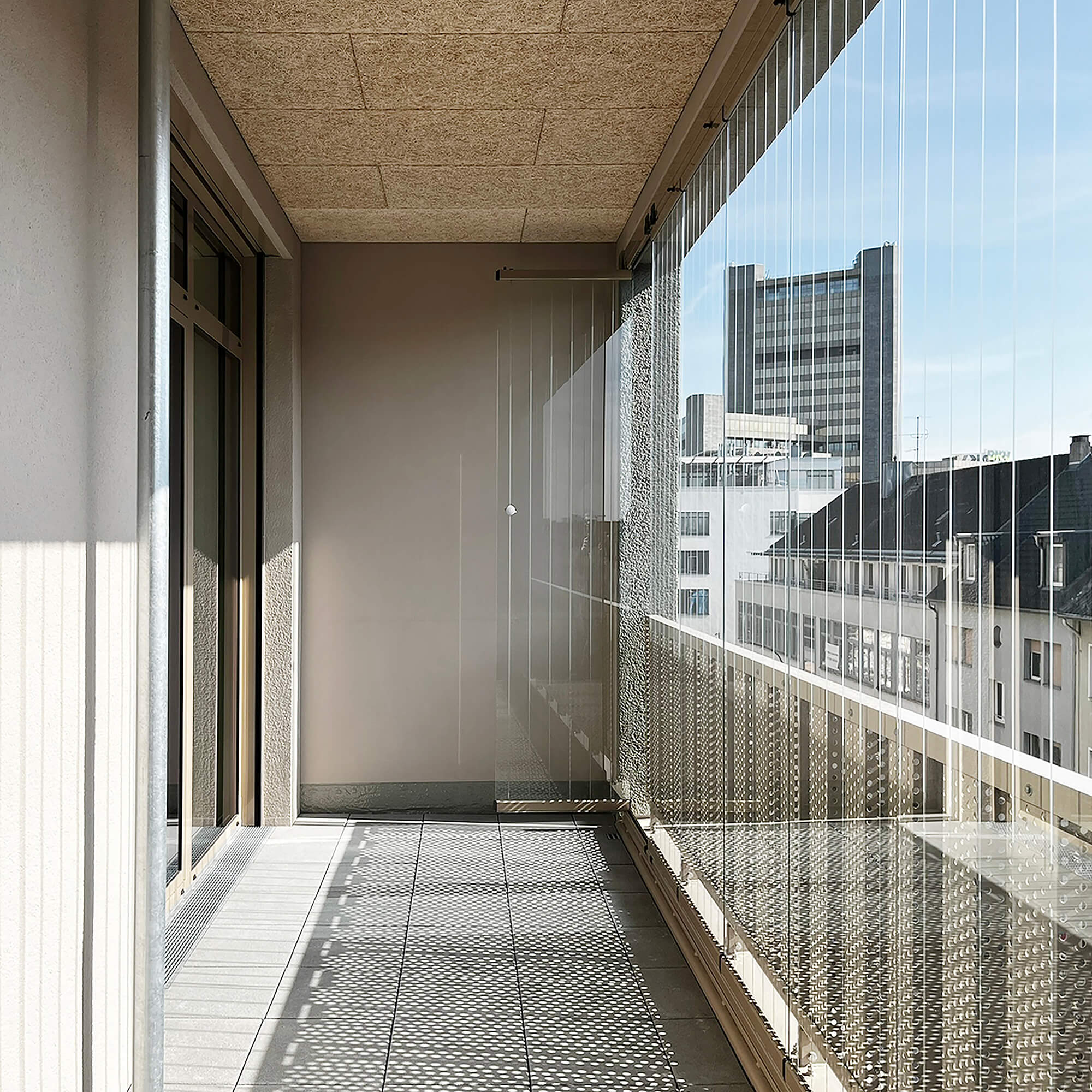 Alle 75 Wohnungen verfügen über besondere Lärmschutzgrundrisse, da an drei Gebäudeseiten wegen Gewerbelärm keine öffenbaren Fenster zulässig sind. Die Belichtung erfolgt über große Festverglasungen, die über Wartungsstege gepflegt werden können. Um trotz Straßenlärm hochwertige private Außenräume zu schaffen, wurde die Südfassade als Loggiafassade mit massiven Schotten zur akustischen und visuellen Abschirmung entwickelt. Viele Loggien verfügen über Schallschutzverglasung oder sind dafür vorbereitbar. Die massiven Schotten tragen zudem die Lasten der Südfassade bis in die Tiefgarage ab. Wo immer es die Lärmschutzanforderungen zulassen, sind die Wohnungen als Durchwohneinheiten organisiert. Dadurch entstehen attraktive Blickbeziehungen sowohl in die unmittelbare Umgebung als auch in die weiter gefassten Stadträume. Diese Durchlässigkeit unterstützt ein großzügiges Wohngefühl und ermöglicht es den Bewohnern, je nach Tageszeit unterschiedliche Lichtstimmungen und Ausblicke zu nutzen.
