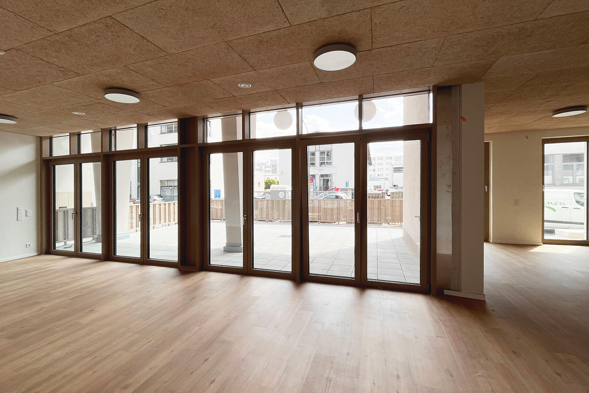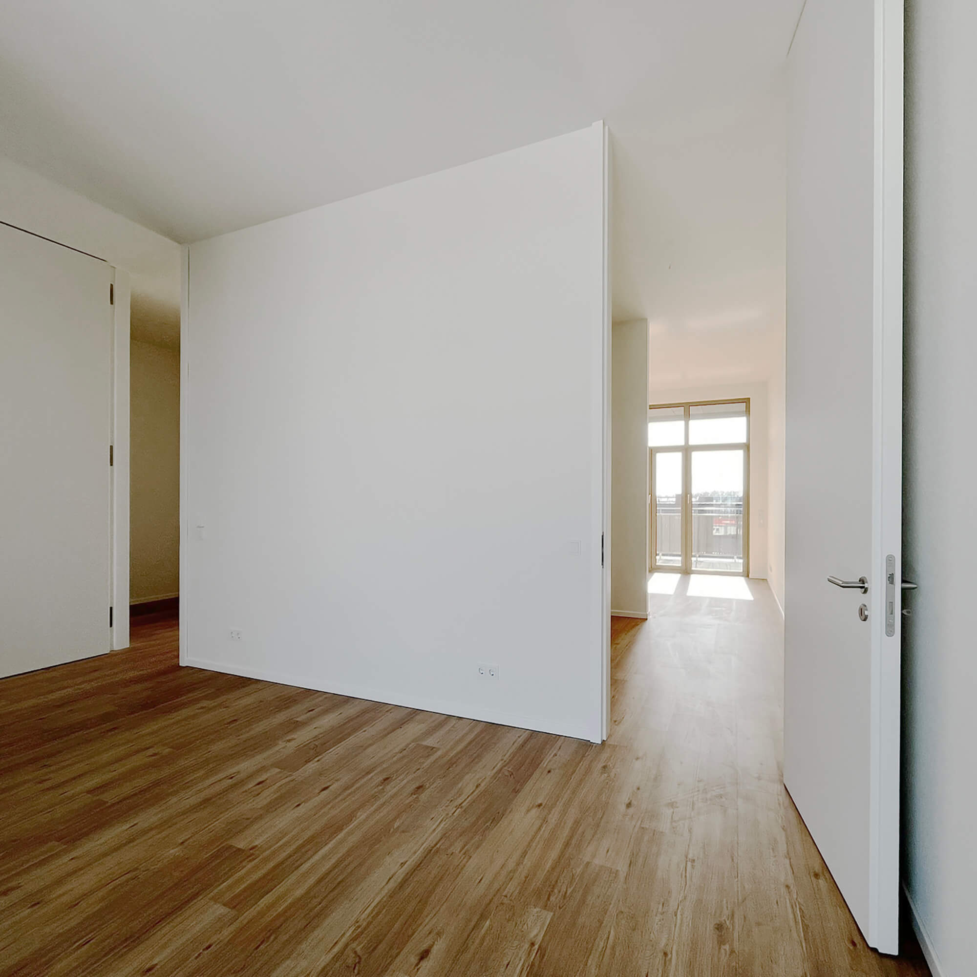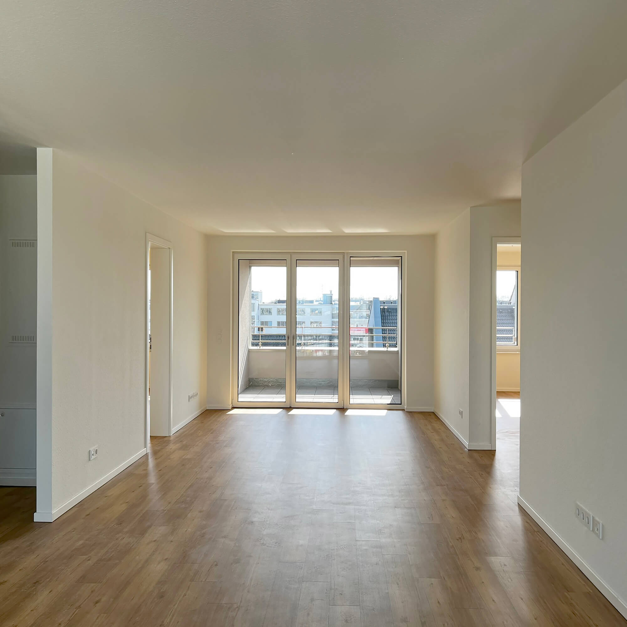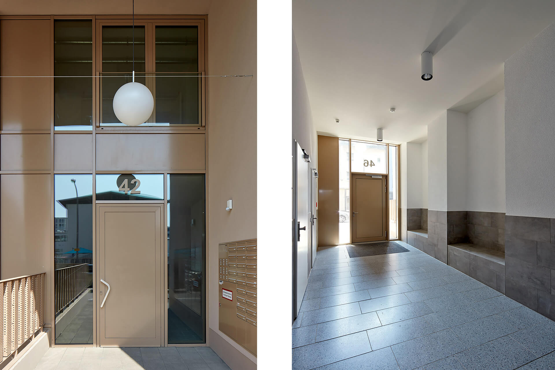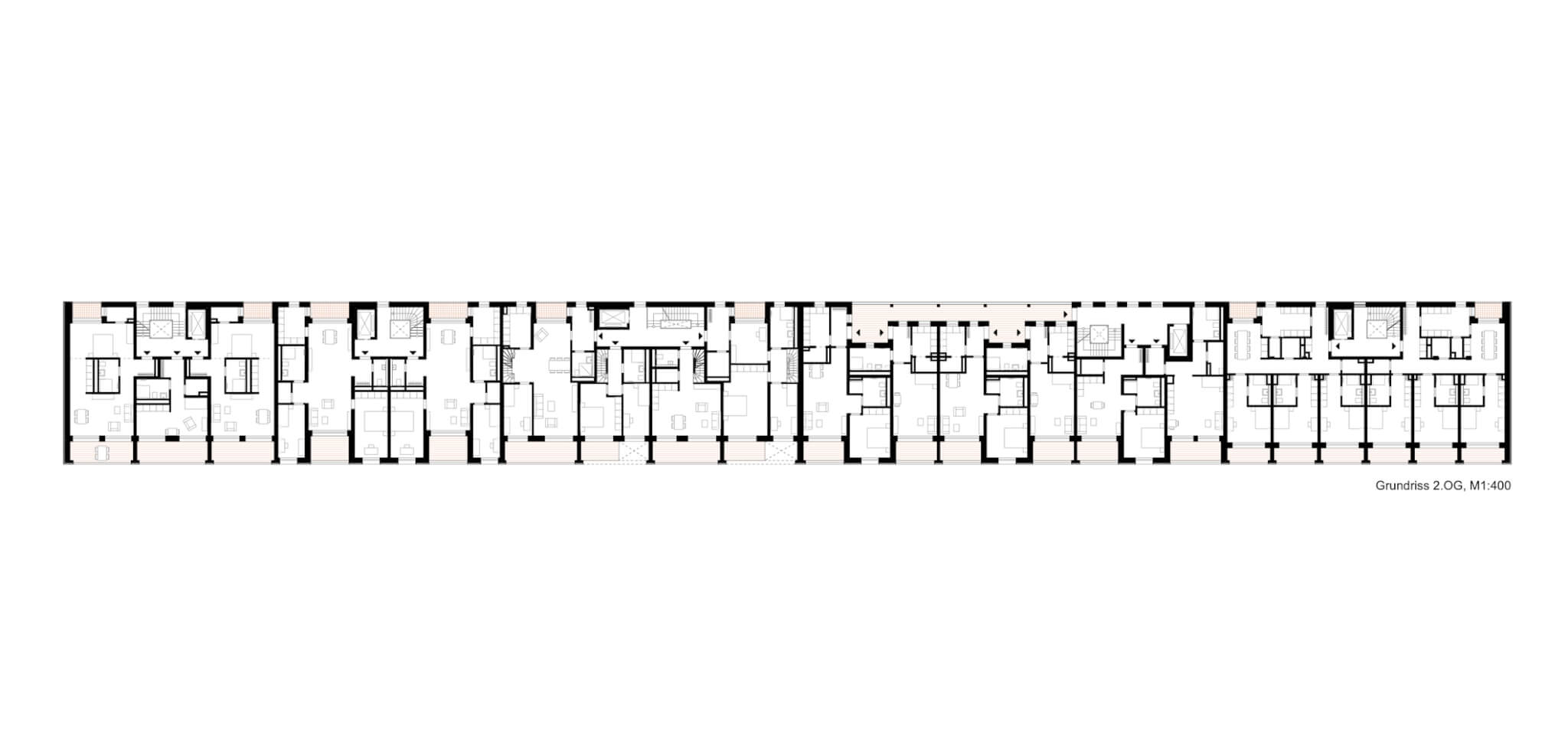 Alle 75 Wohnungen verfügen über besondere Lärmschutzgrundrisse, da an drei Gebäudeseiten wegen Gewerbelärm keine öffenbaren Fenster zulässig sind. Die Belichtung erfolgt über große Festverglasungen, die über Wartungsstege gepflegt werden können. Um trotz Straßenlärm hochwertige private Außenräume zu schaffen, wurde die Südfassade als Loggiafassade mit massiven Schotten zur akustischen und visuellen Abschirmung entwickelt. Viele Loggien verfügen über Schallschutzverglasung oder sind dafür vorbereitbar. Die massiven Schotten tragen zudem die Lasten der Südfassade bis in die Tiefgarage ab. Wo immer es die Lärmschutzanforderungen zulassen, sind die Wohnungen als Durchwohneinheiten organisiert. Dadurch entstehen attraktive Blickbeziehungen sowohl in die unmittelbare Umgebung als auch in die weiter gefassten Stadträume. Diese Durchlässigkeit unterstützt ein großzügiges Wohngefühl und ermöglicht es den Bewohnern, je nach Tageszeit unterschiedliche Lichtstimmungen und Ausblicke zu nutzen.