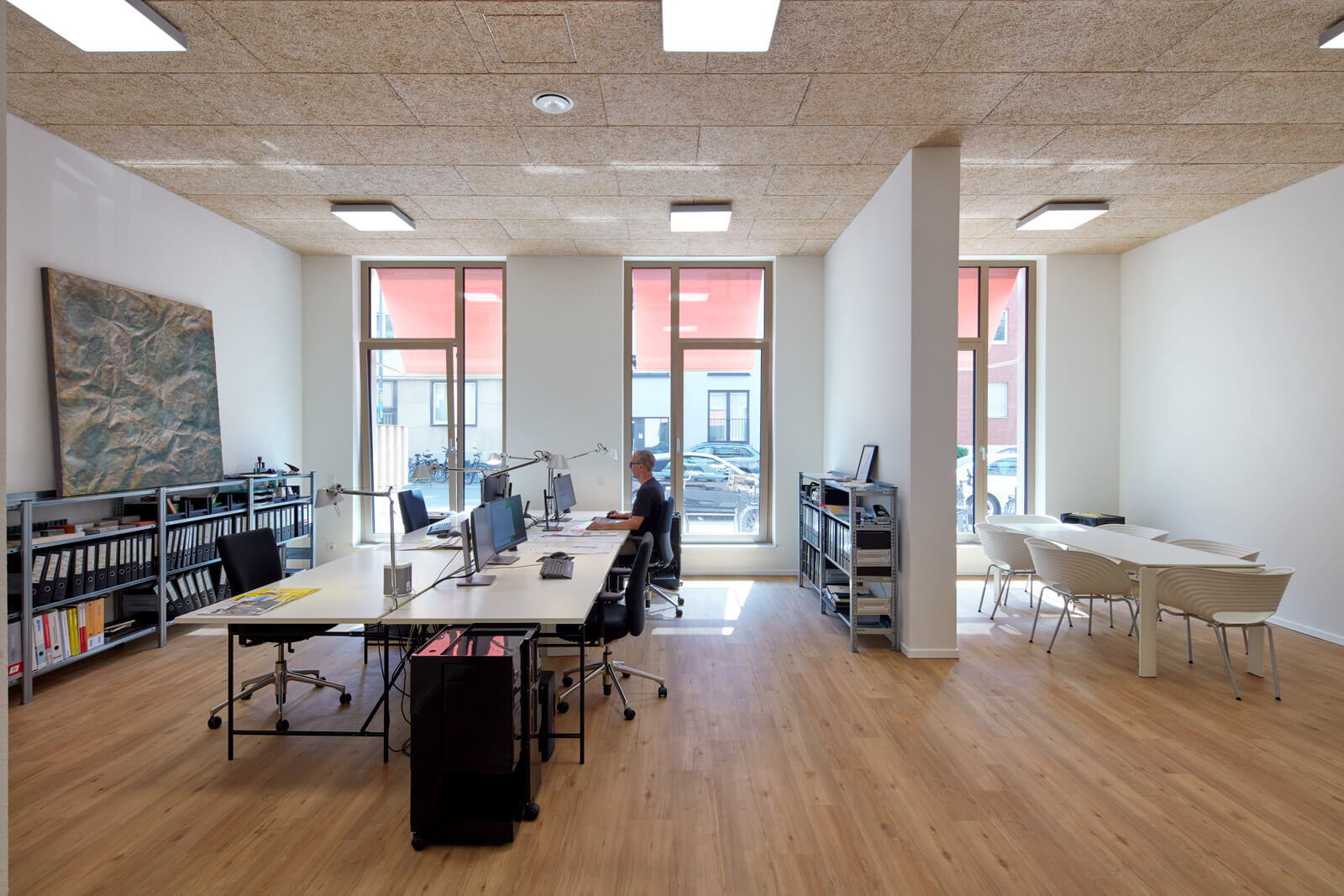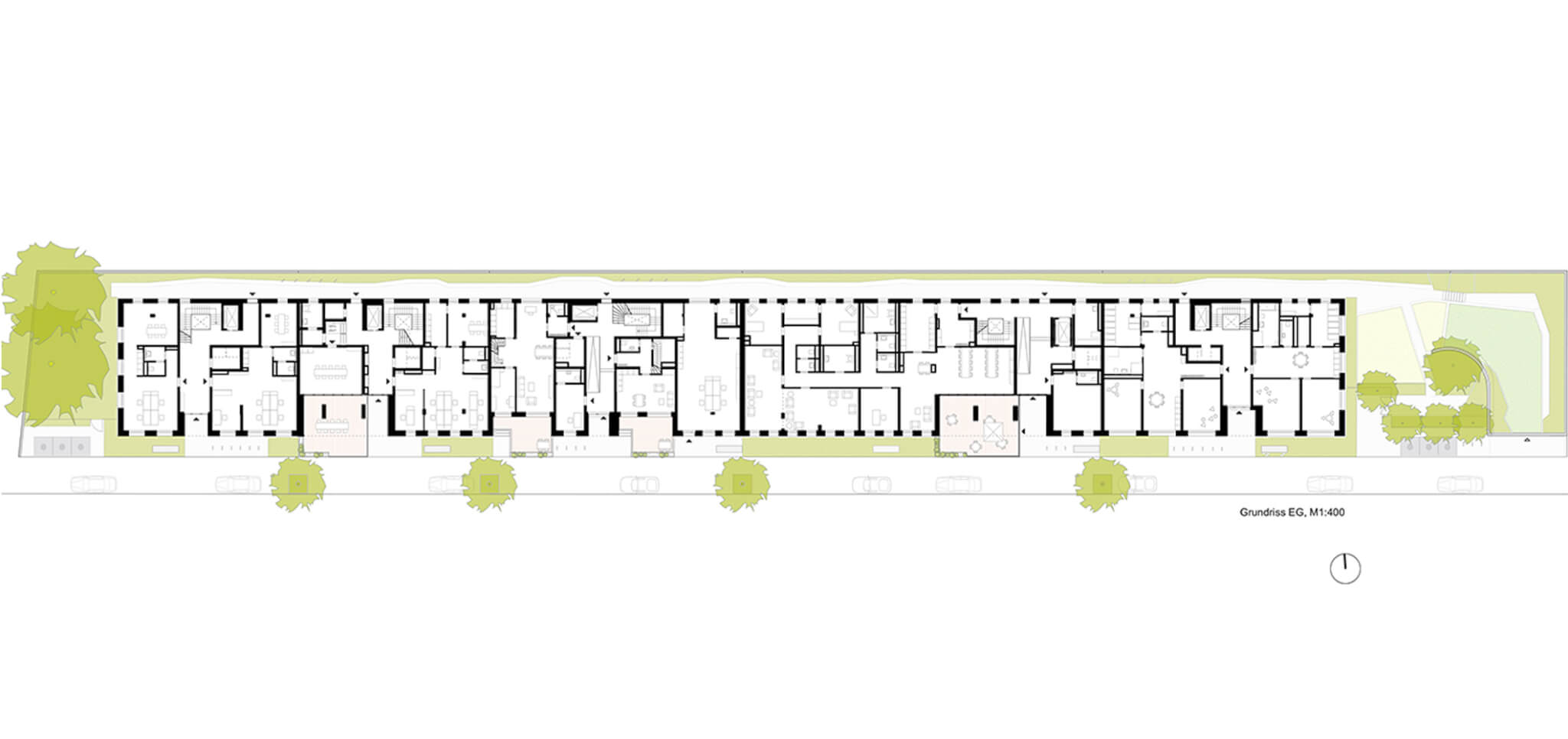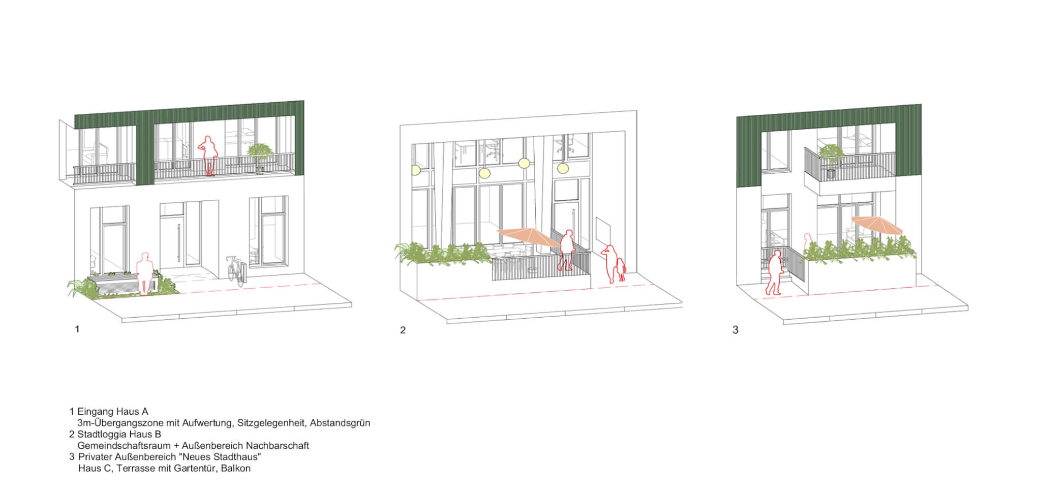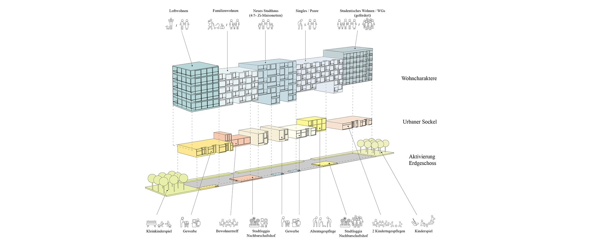 Das Langhaus Köln setzt sich aus zwei Elementen zusammen; einem „urbanen Sockel“ und einer Abfolge verschiedener „Wohncharaktere“, die sich auf dem Sockel aneinanderreihen. Der urbane Sockel greift eine Vielzahl vitaler, urbaner Funktionen des Stadtteils auf, die die Erdgeschosszone beleben und menschliche Interaktion ermöglichen: Neben Flächen für Dienstleistungen und soziale Einrichtungen sind im Sockel diverse Funktionen angeordnet, die dem nachbarschaftlichen Zusammenleben dienen. Der Sockel umfasst zwei Nachbarschaftshöfe, die, ähnlich wie der Hof eines Geschosswohnungsbaus, als Treffpunkt und zentraler Kommunikationsraum dienen. Diese halböffentlichen Außenräume sind vielseitig nutzbar; sie bieten Raum für Begegnungen, Kinderspiel, Hausfeste, Jugendliche, gemeinschaftliche Beete und Pflanzen und vieles mehr. Sie ermöglichen eine Interaktion zwischen den Bewohnern und dem öffentlichen Raum. An einen der Höfe grenzt unmittelbar ein Gemeinschaftraum an – der Außenraum ergänzt im Sommer den Innenraum.