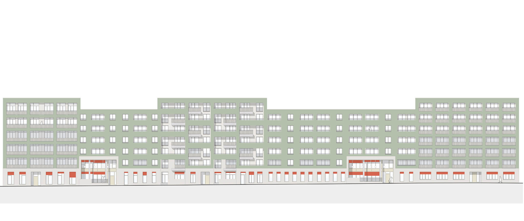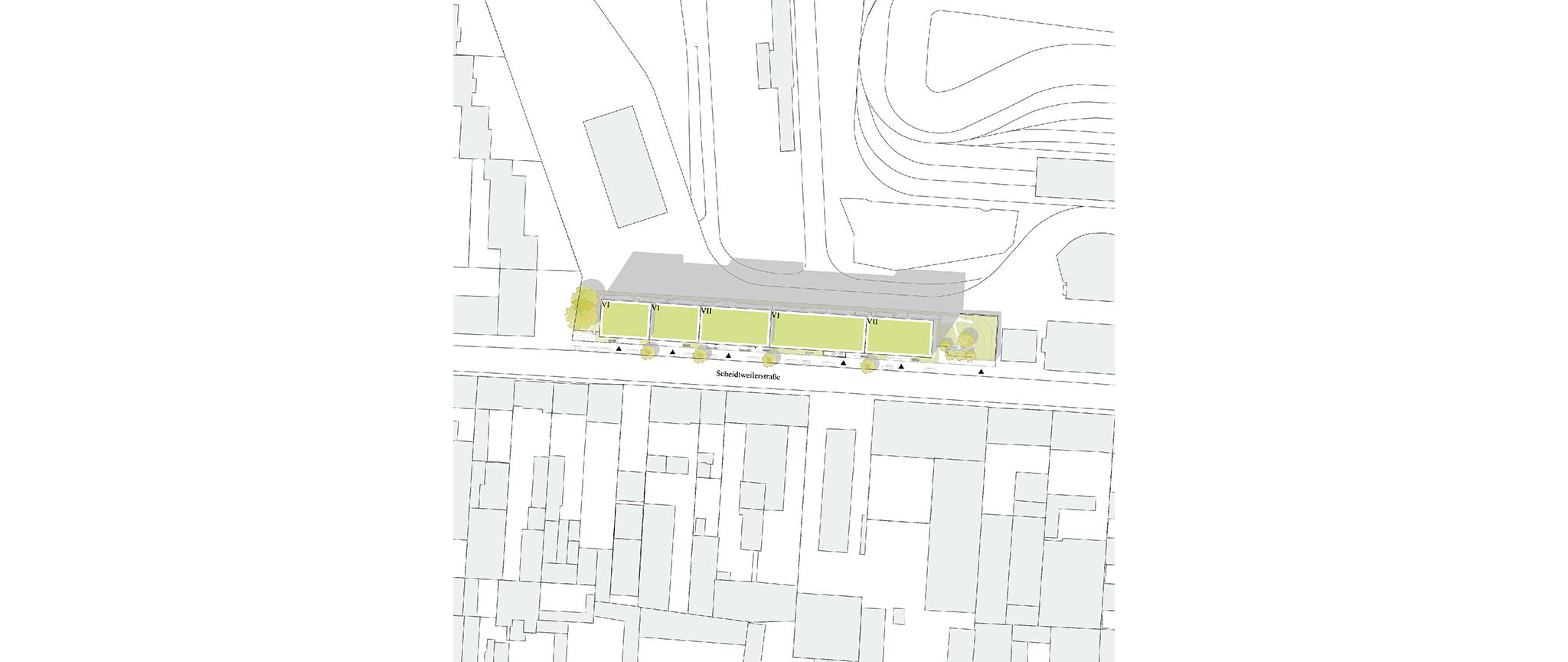 Als Gewinner der Entwurfswerkstatt ZUKUNFT WOHNEN – Weiterentwicklung von Bestandssiedlungen in Köln, Standort Scheidtweiler Straße, wurden DKA mit der Planung des Gebäudekomplexes beauftragt. Entsprechend unseres Konzeptes aus der Entwurfswerkstatt, bildet das Langhaus Braunsfeld an der Schnittstelle zwischen großmaßstäblichem Gewerbe und kleinteiliger Wohnbebauung auf dem schmalen Grundstück einen 132 m langen, durchgängigen Gebäudeköper aus. Es entsteht ein großes Ganzes, das es vermag, die Raumkanten des Straßenzugs zu schließen und diesem eine neue Urbanität zu verleihen. Gleichzeitig nimmt der Baukörper die Körnung und Kleinteiligkeit der näheren Umgebung auf, indem das Volumen in einzelne Teile gegliedert wird.