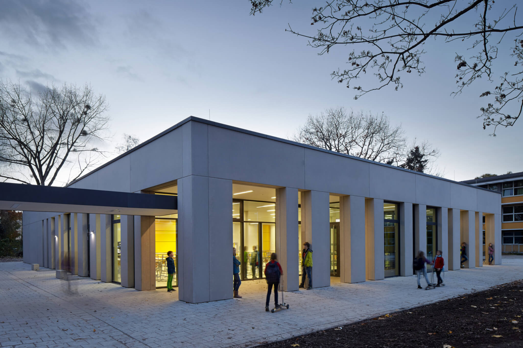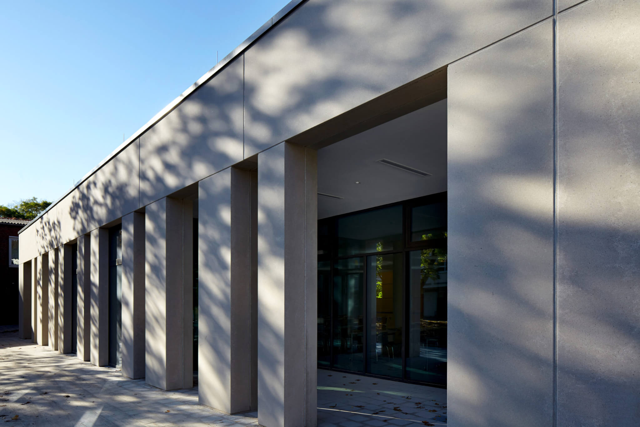 Der Neubau der Schulmensa auf dem Gelände der Katharina-Henoth-Gesamtschule in Köln-Höhenberg ersetzt einen kleineren Altbau am selben Ort. Eingebettet in die Grünanlagen der Schule zeigt sich die Schulmensa als Solitär, der sich an den Gebäudekanten der Aula orientiert und maßvolle Außenräume zu den bestehenden Gebäudeflanken definiert.