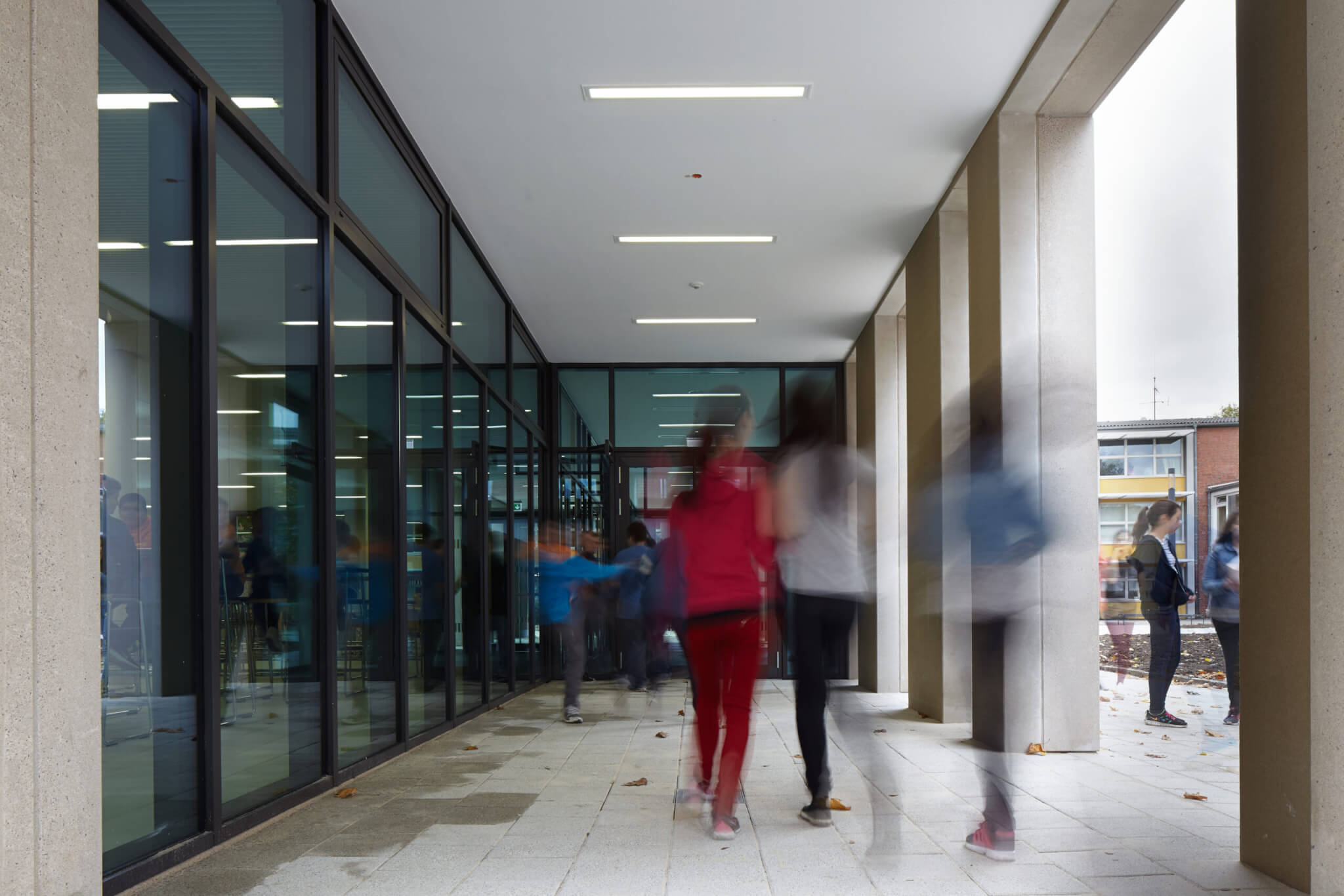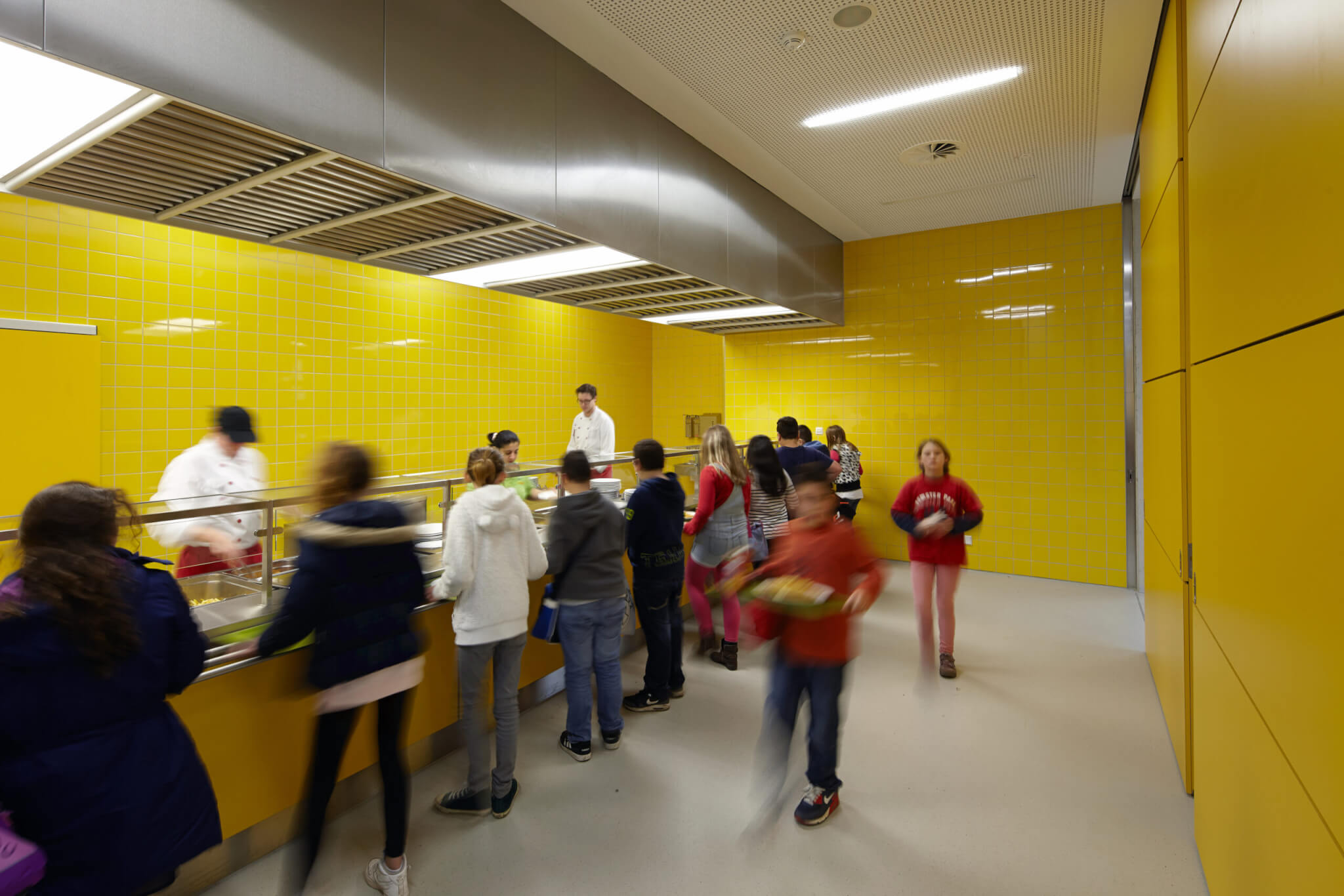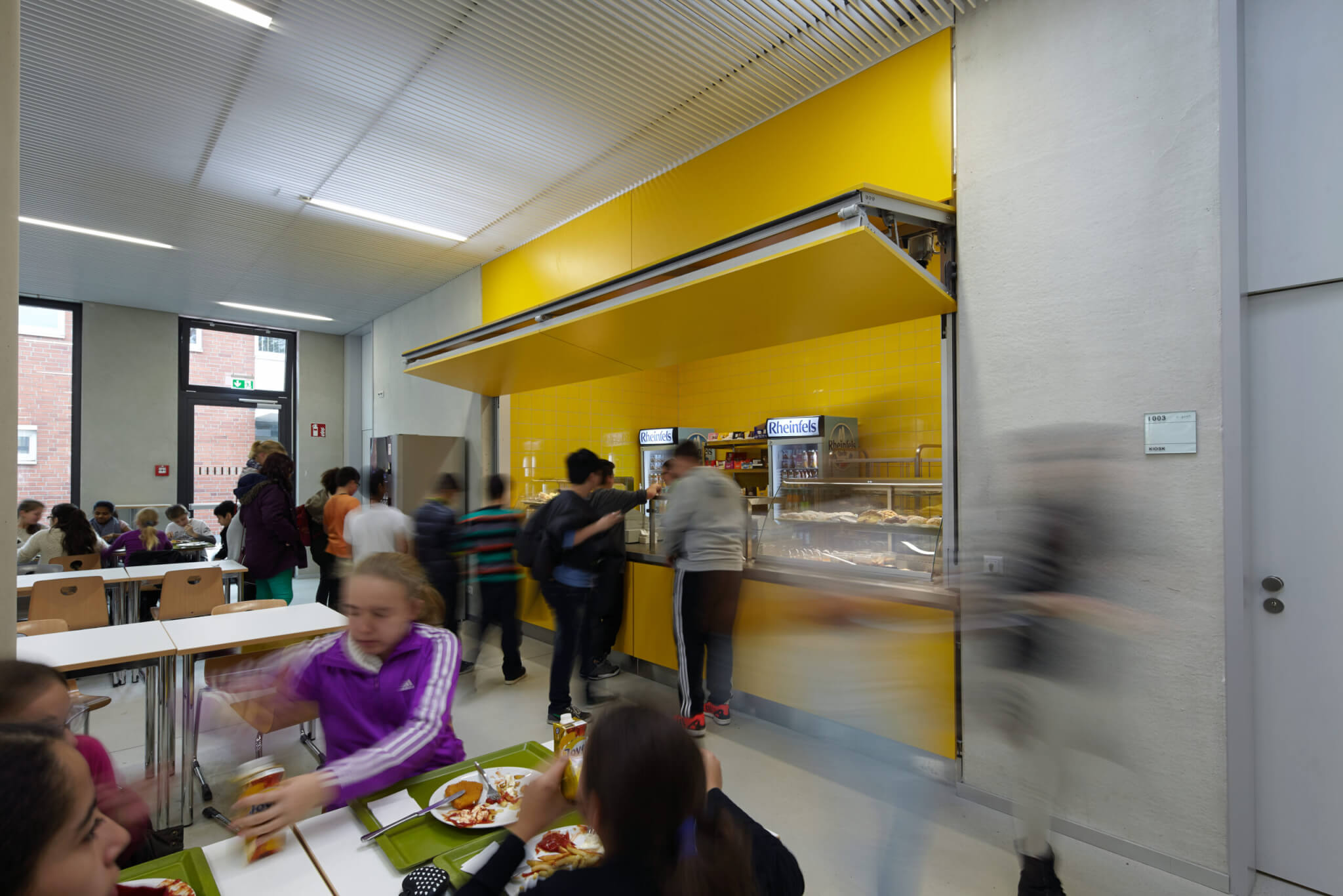 Der Speisesaal der Mensa kann mittig geteilt werden und lässt so eine zeitgleiche Nutzung beider Teile zu. Die Trennung ist so konzipiert, dass bei geschlossener Trennwand beide Nutzungseinheiten ohne funktionale Einschränkung über den Vordach- und Windfangbereich zugänglich sind. Neben dem Mensabetrieb auf halbierter Fläche, ist zeitgleich die Nutzung des anderen Teils als Aufenthaltsraum für die Oberstufe möglich, dem auch ein Kiosk zugeordnet ist.