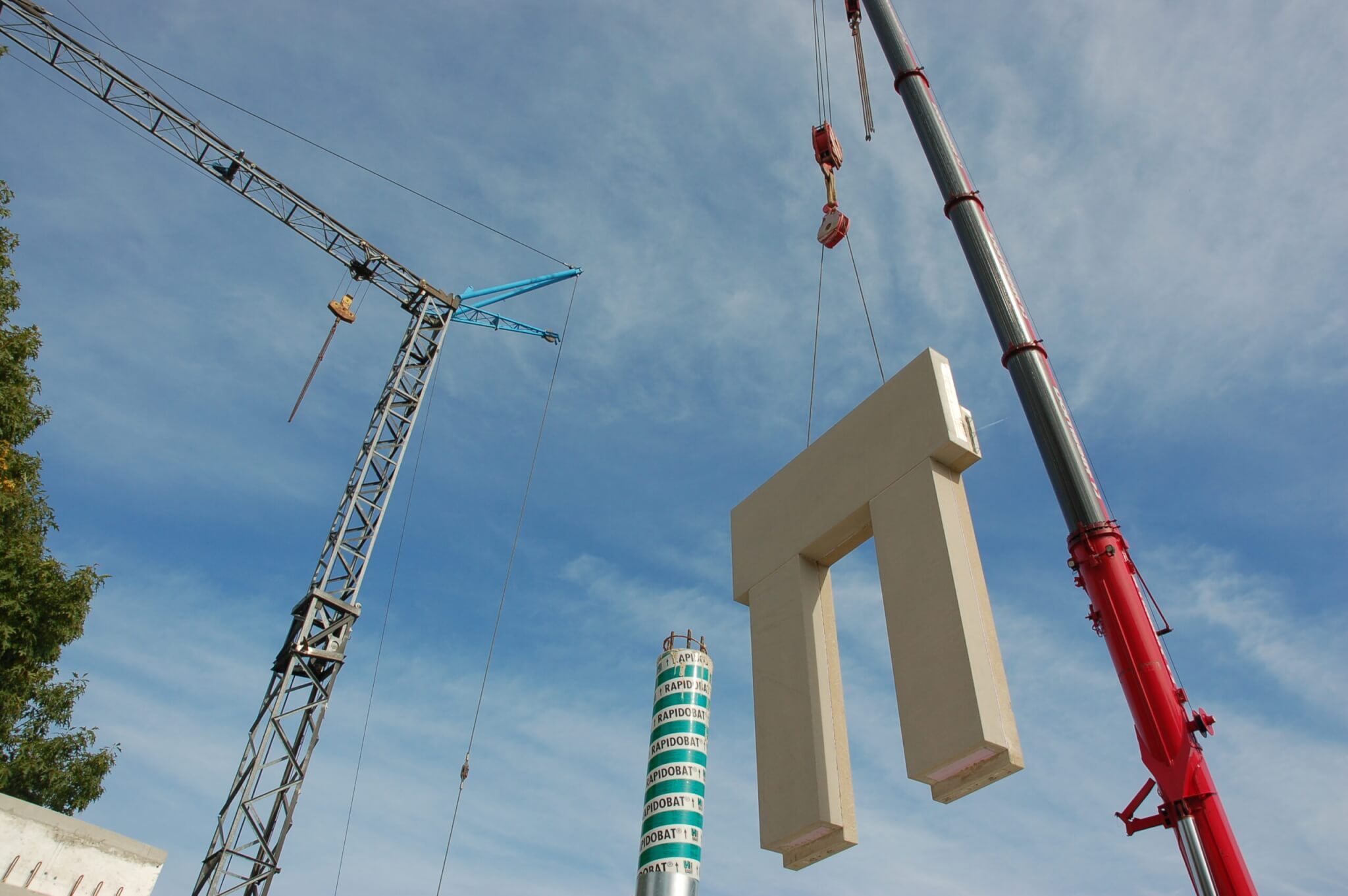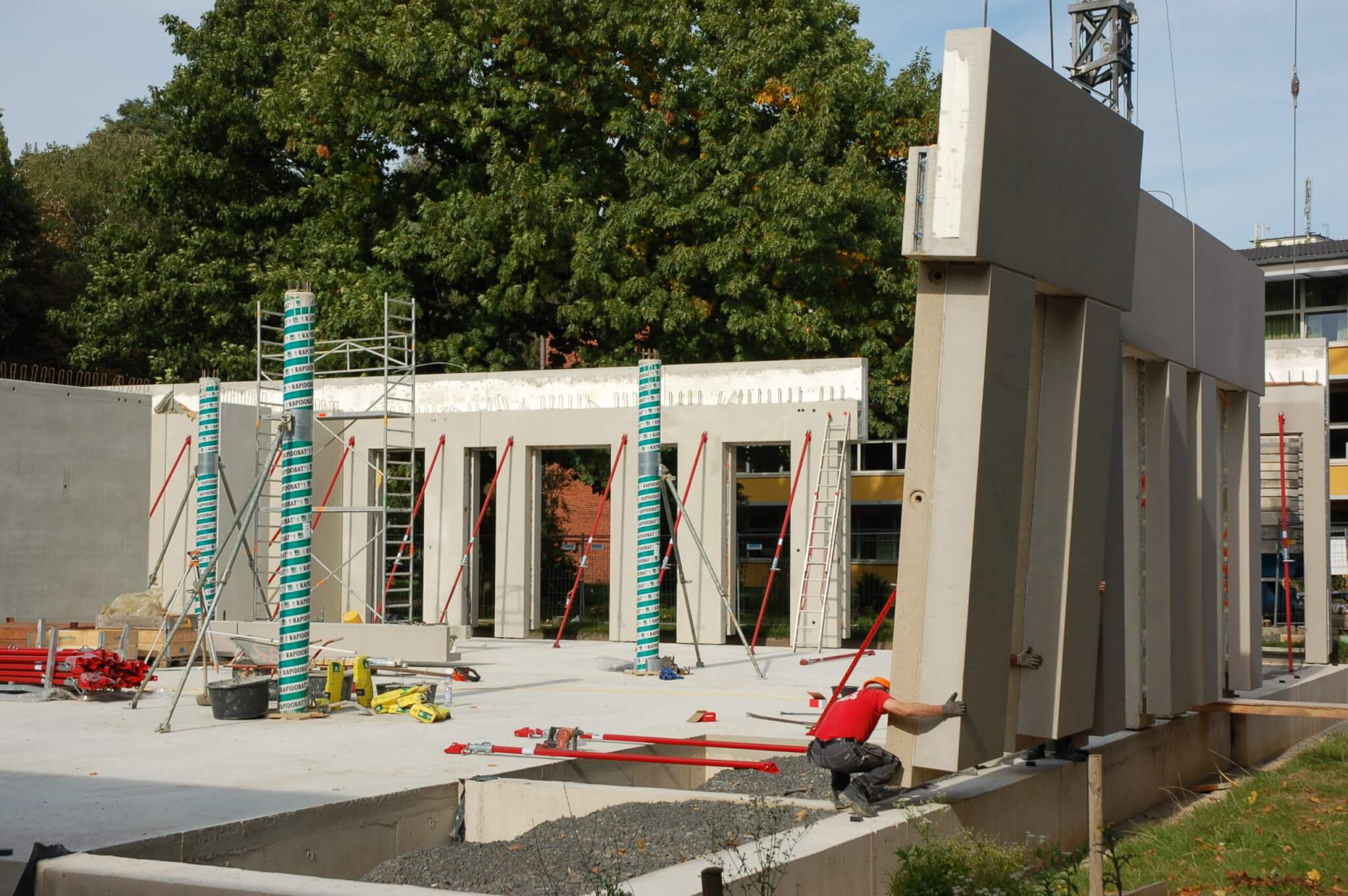 Die Konstruktion des Gebäudes erfolgte in Massivbauweise aus Stahlbeton. Die tragende Gebäudehülle besteht aus Sichtbeton-Sandwichelementen. Die Beton-Sandwichelemente setzen sich aus einer äußeren Betonschale, Kerndämmung und einer tragenden Betoninnenschale zusammen. Dafür wurde ein 52 cm starkes Sandwichelement mit Trag-, Vorsatzschale und Dämmung in einem Arbeitsgang erstellt.