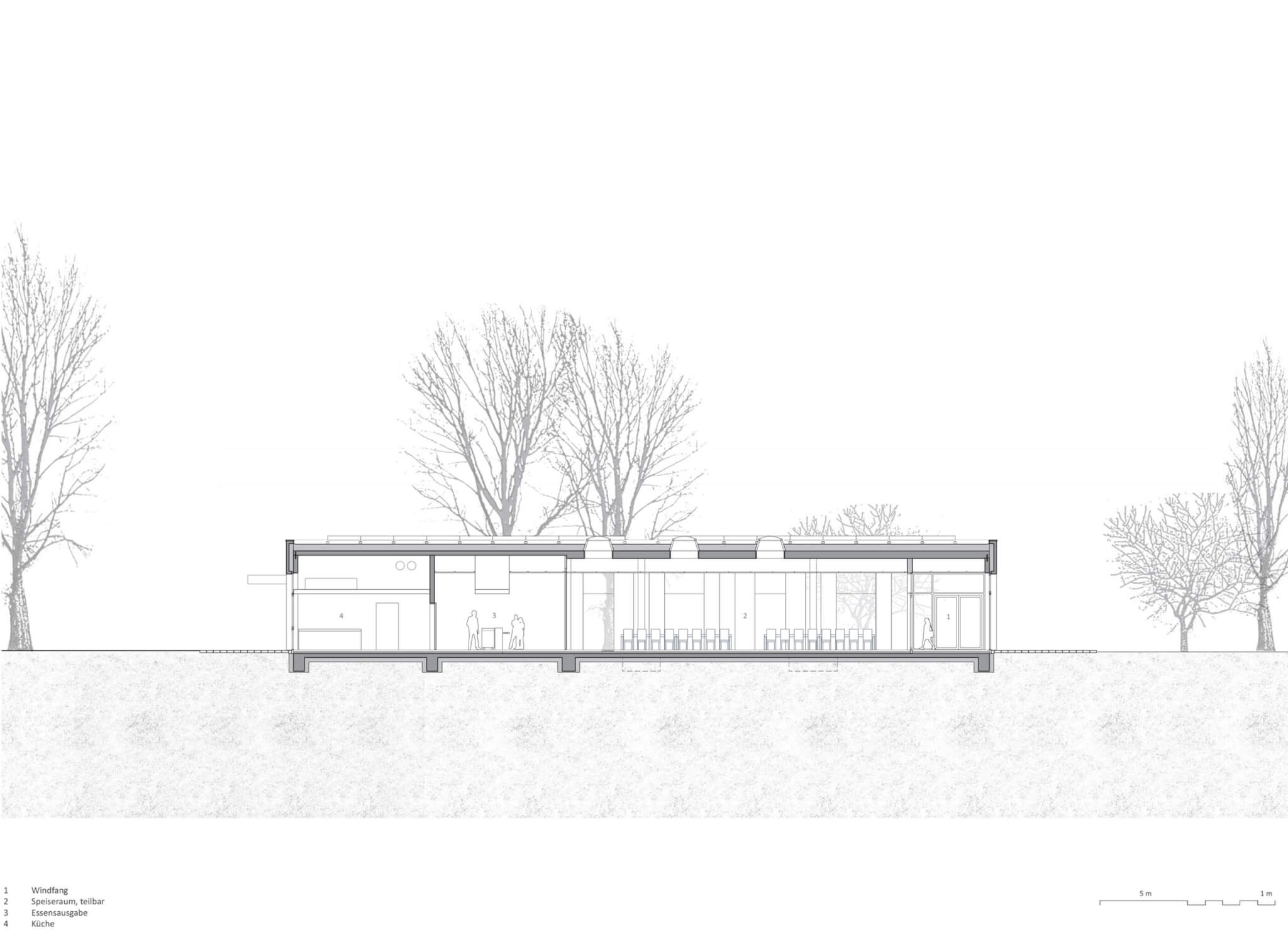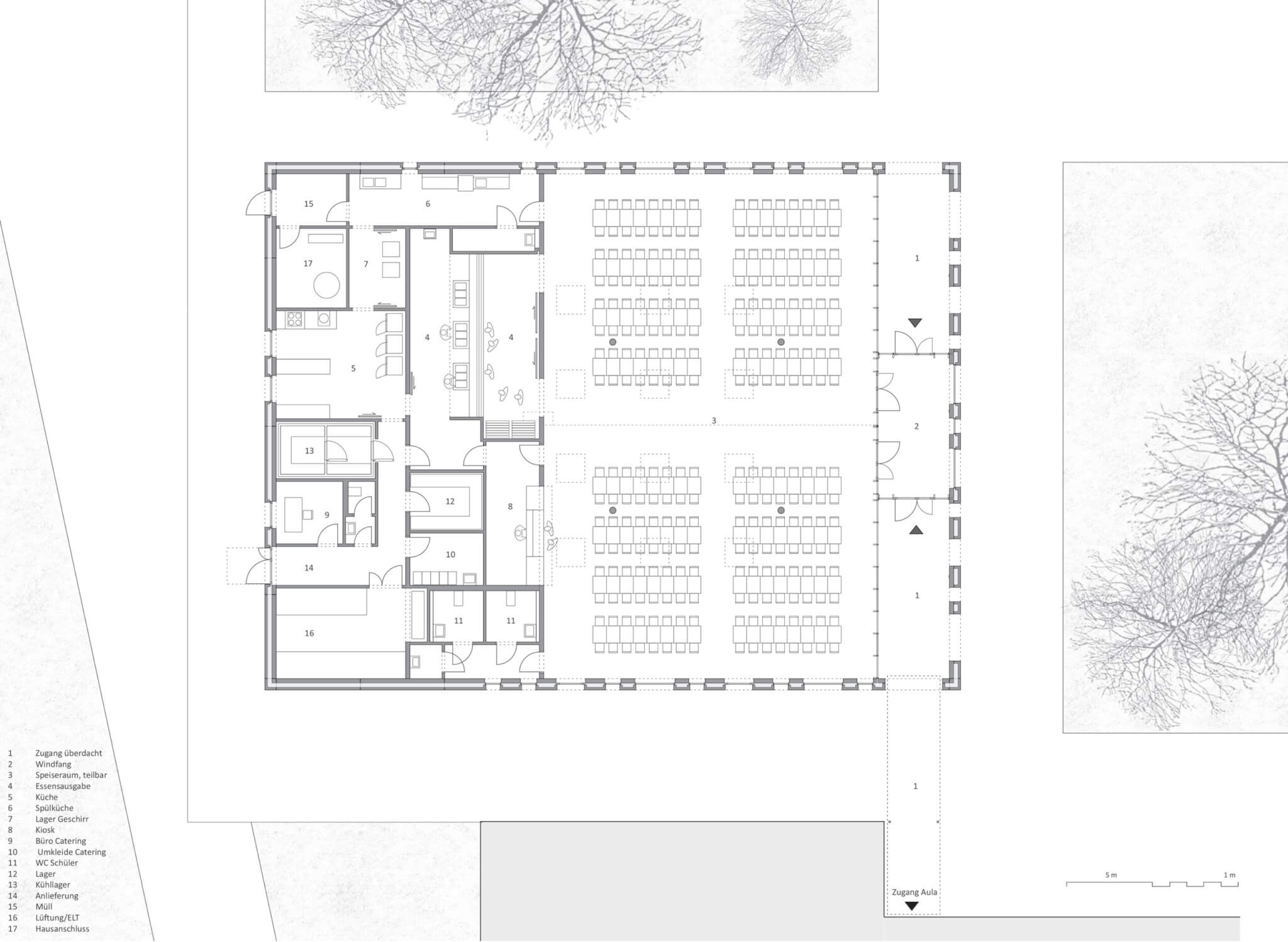 Der Grundriss gliedert sich in drei Bereiche: Eingangszone, Speisesaal und Küche. Der Speisesaal bietet 256 Sitzplätze auf insgesamt 360 m², die Küche ist als Vollküche für max. 300 Verpflegungsteilnehmer konzipiert. Alle drei Bereiche werden in einer klaren, einfachen Gebäudekubatur zusammengefasst und von einer Außenhülle, gleich einem Vorhang umfasst. Im Bereich der Zugänge löst sich diese Außenhülle von der Innenhülle und bildet zwei überdachte Eingangs- und Wartebereiche aus. Im Speisebereich der Mensa ist die Hülle weitestgehend transparent, im Bereich der Küche und der andienenden Räume reduzieren sich die Öffnungen auf die für die Belichtung der dahinterliegenden Nutzungen notwendige Anzahl und Größe.