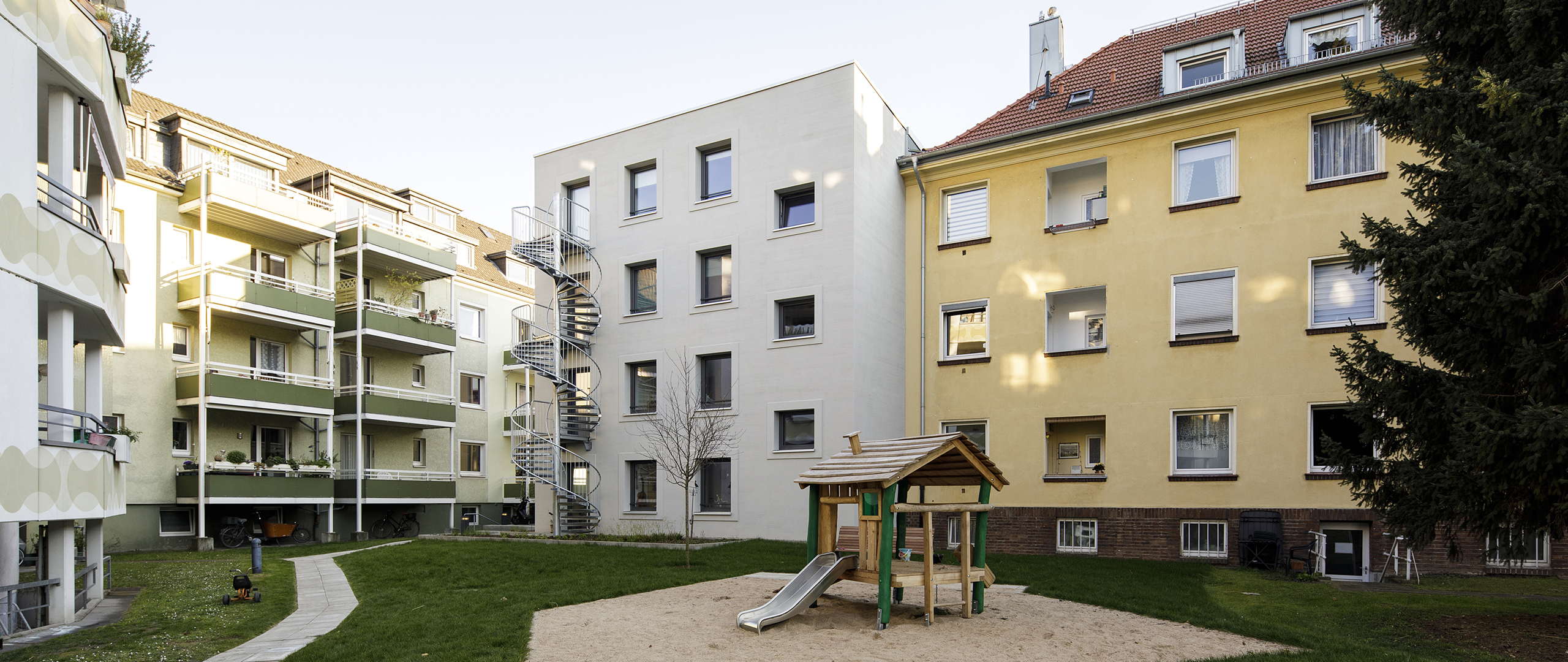 Der gesamte Block, inklusive Neubau, befindet sich im Eigentum der gemeinnützigen Wohnungsgenossenschaft DIE EHRENFELDER. Trotz der begrenzten Baufläche konnten familiengerechte 4-Zimmer-Einheiten mit 92 m² Nutzfläche realisiert werden.