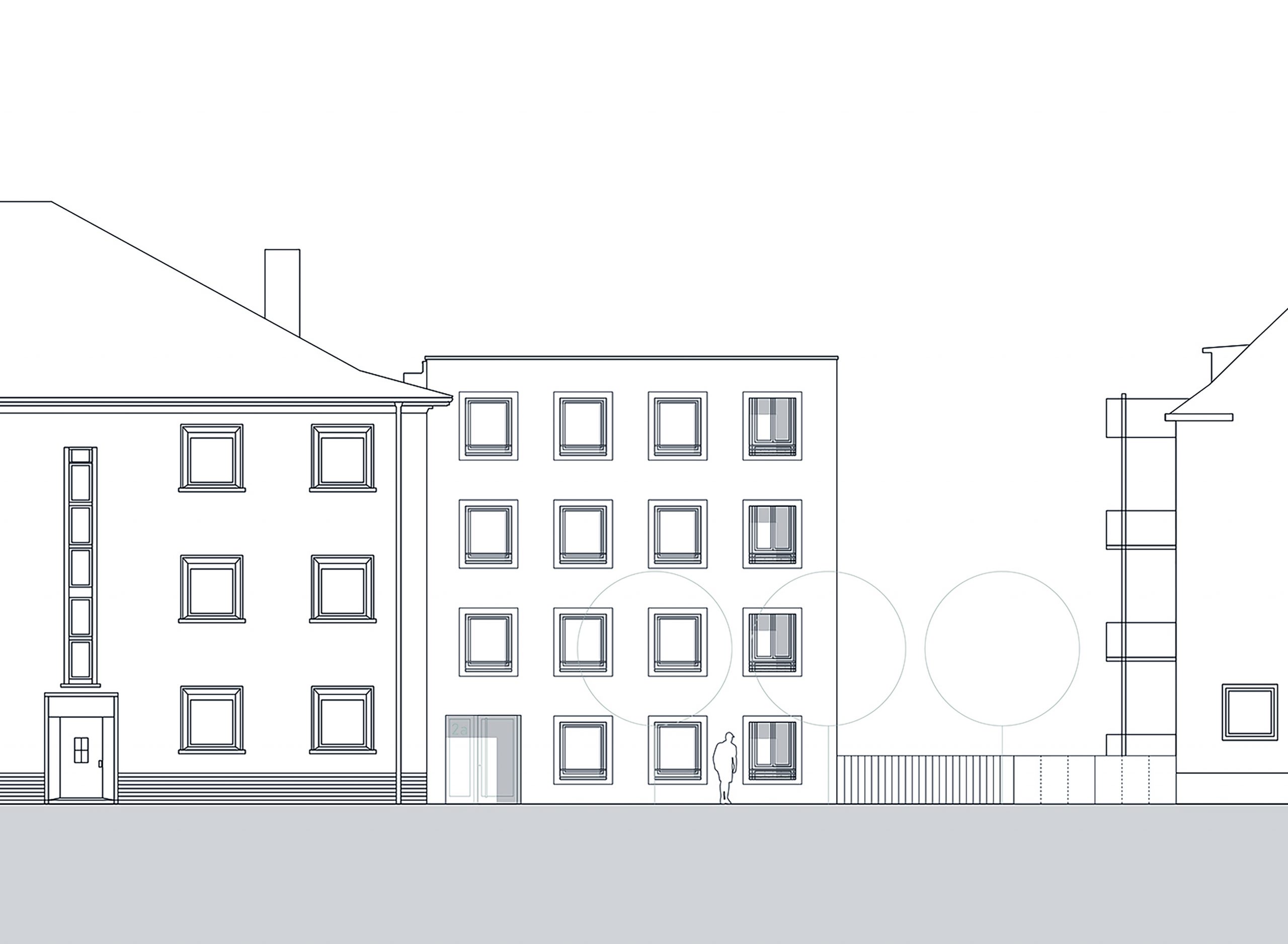 Der Neubau steht in Bezug zu dem denkmalgeschützten Ensemble der 1930er Jahre, gruppiert um einen Platz mit Brunnenanlage. Der Baukörper bildet den Schlussstein der historischen Häuserzeile. Durch das kubische Volumen und die monochrome Gestalt, sowie einem Rücksprung aus der Straßenflucht nimmt der Neubau eine eigenständige städtebauliche Haltung ein. Die privaten Freisitze werden als Loggien zu einem Teil des Gebäudes und unterstreichen dessen klare, kubische Form. Der Versprung des Baukörpers schafft zudem Raum für eine straßenbegleitende Bepflanzung. In Korrelation zu der Eigenständigkeit der Gestalt, liefert der Neubau ebenso Antworten auf den Denkmalschutz des Nachbargebäudes und schafft durch Fensterformate, Fensterfaschen und einen Besenstrichputz historische Bezüge.